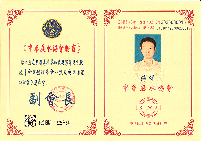 海洋老师,男,现年59岁,八十年代大学本科生,高级工程师,高级预测师,现任中华易经风水协会副会长。